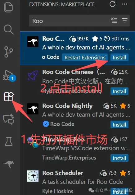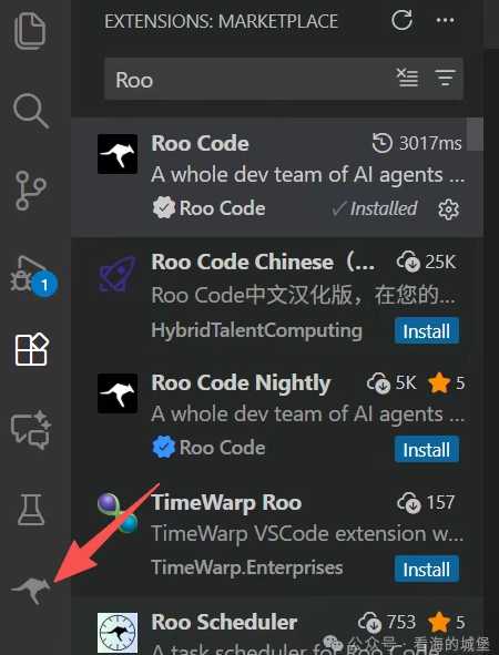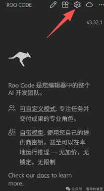 - 打开插件:安装完成后,侧边栏会出现Roo Code的图标,点击它。
