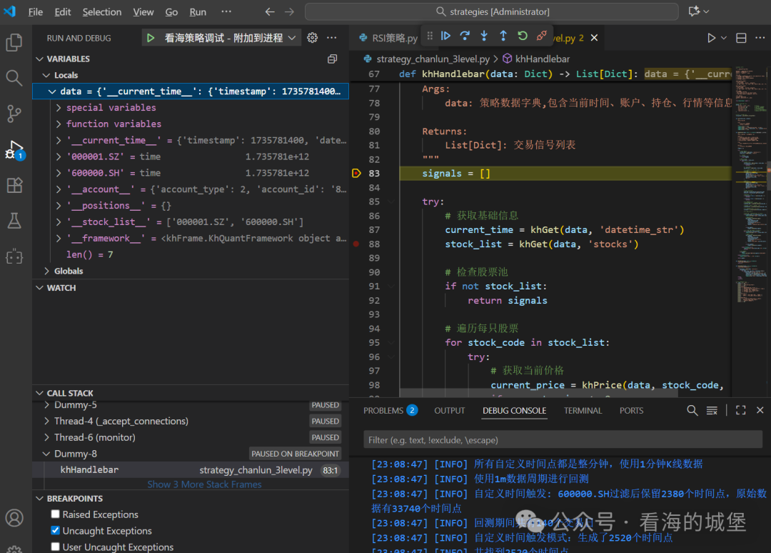 - 自动聚焦:此时,内置VS Code窗口将自动弹出并获得焦点,进入调试视图。您可以在此清晰地看到当前所有变量的值,并使用顶部的调试工具栏进行单步执行、继续执行等操作,彻底洞察策略运行的每一个瞬间。