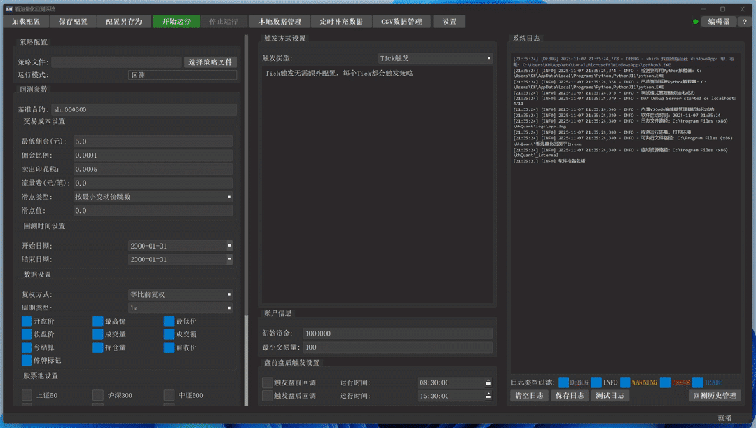 * 自动进入调试模式:在编辑器打开的状态下,从主界面点击“开始回测”,系统将自动启用调试模式。您可以在代码中设置断点,对策略进行单步跟踪、查看变量,深入洞察策略运行的每一个细节。