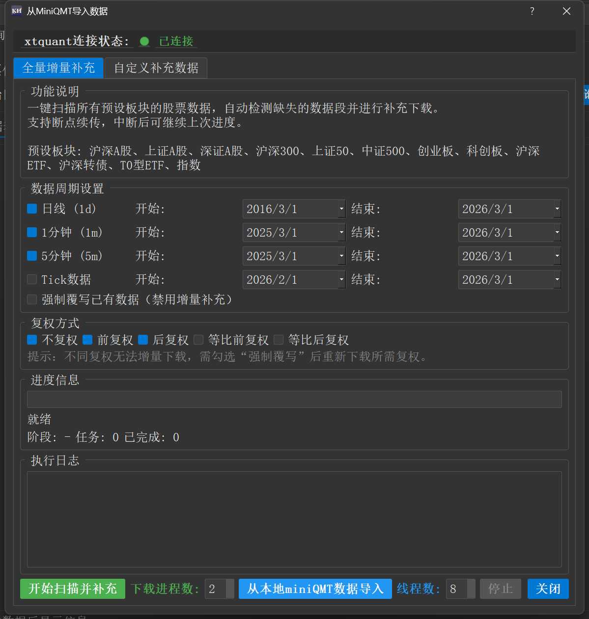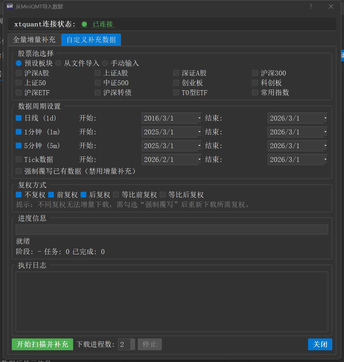 - 自定义补充数据:灵活选择股票池和数据范围,适合针对性导入特定股票或时间段的数据。