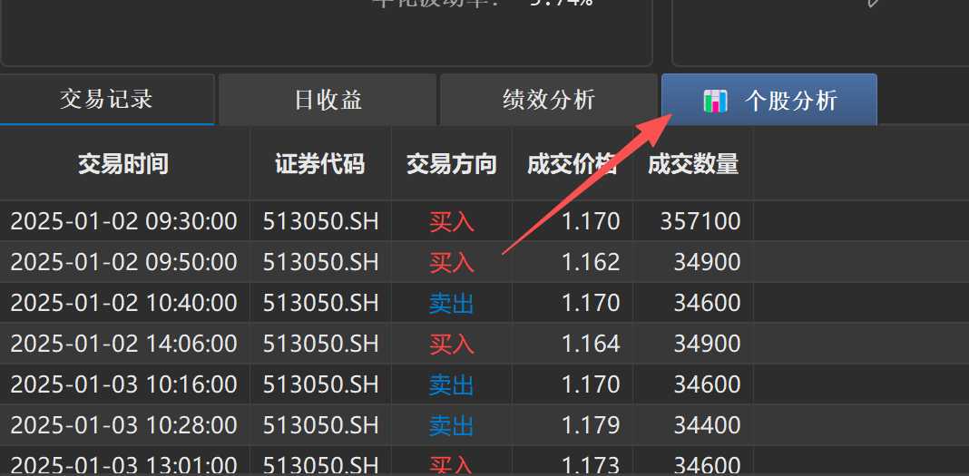 - 自由切换标的:在多股票回测中,用户可以单独选择并查看每一只股票的交易详情。