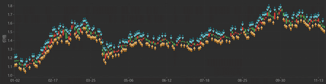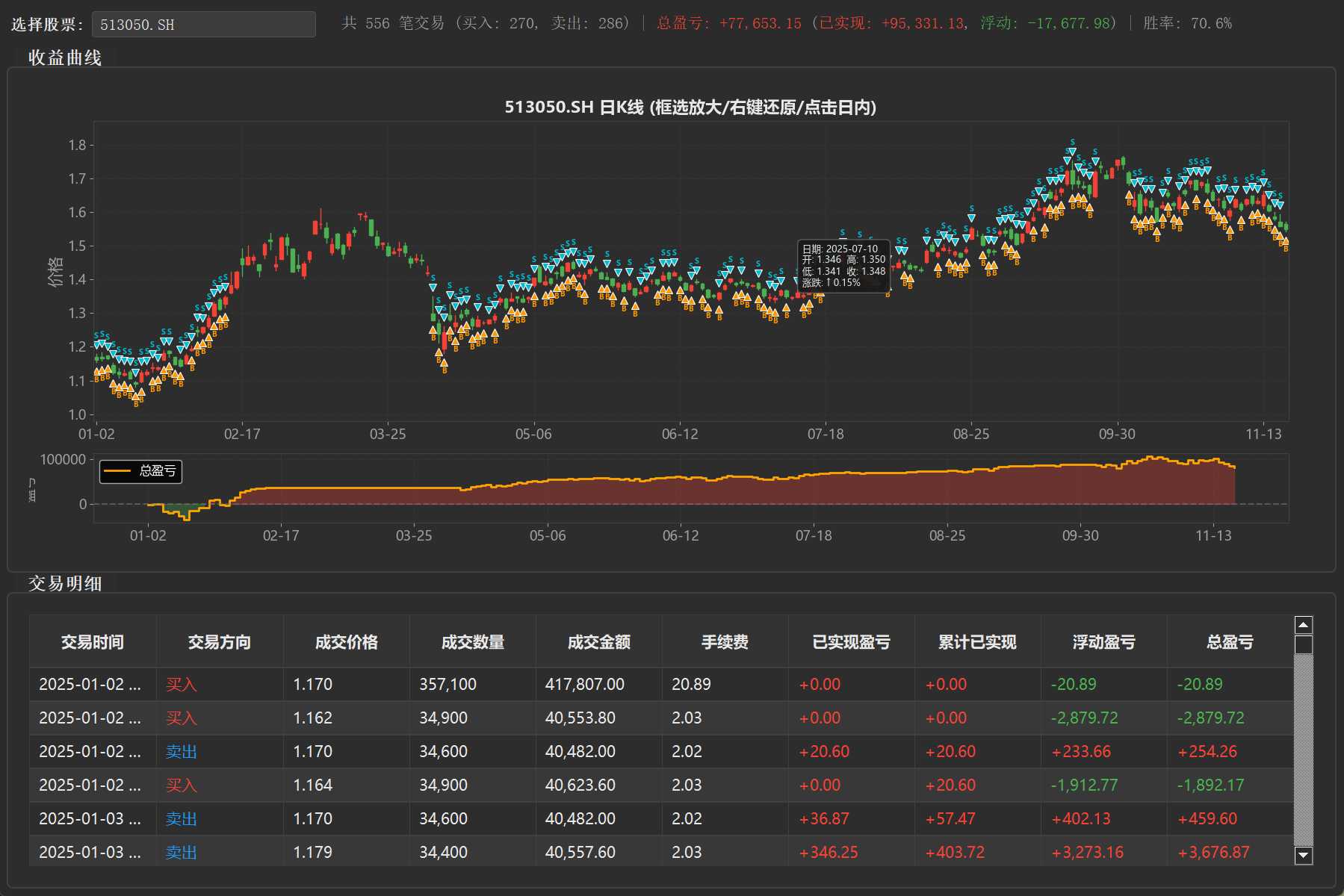 - 买卖点可视化:系统会在K线图上自动标注出所有的买入(B点)和卖出(S点),让用户一眼看清策略是在“山顶站岗”还是在“山底抄底”。
