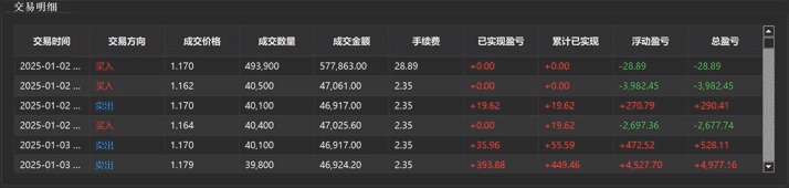 - 费用明细拆解:T0策略对费率极度敏感。新报告详细拆解了每一笔成交的 交易成本(佣金、印花税、过户费)。特别是对于ETF免印花税的特性,系统能精确计算出每一笔“微利”交易的真实净回报,让你看清策略是在“赚钱”还是在“帮券商打工”。